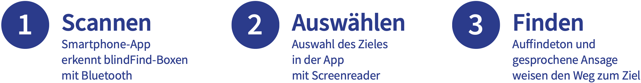 Die App listet zunächst die relevanten Orte im Raum auf. Der Nutzer kann im Anschluss einen der angezeigten Zielpunkte auf dem Mobilgerät auswählen. Es entsteht eine Bluetoothverbindung zwischen Smartphone oder Smart Watch und der entsprechenden blindFind-Box.
